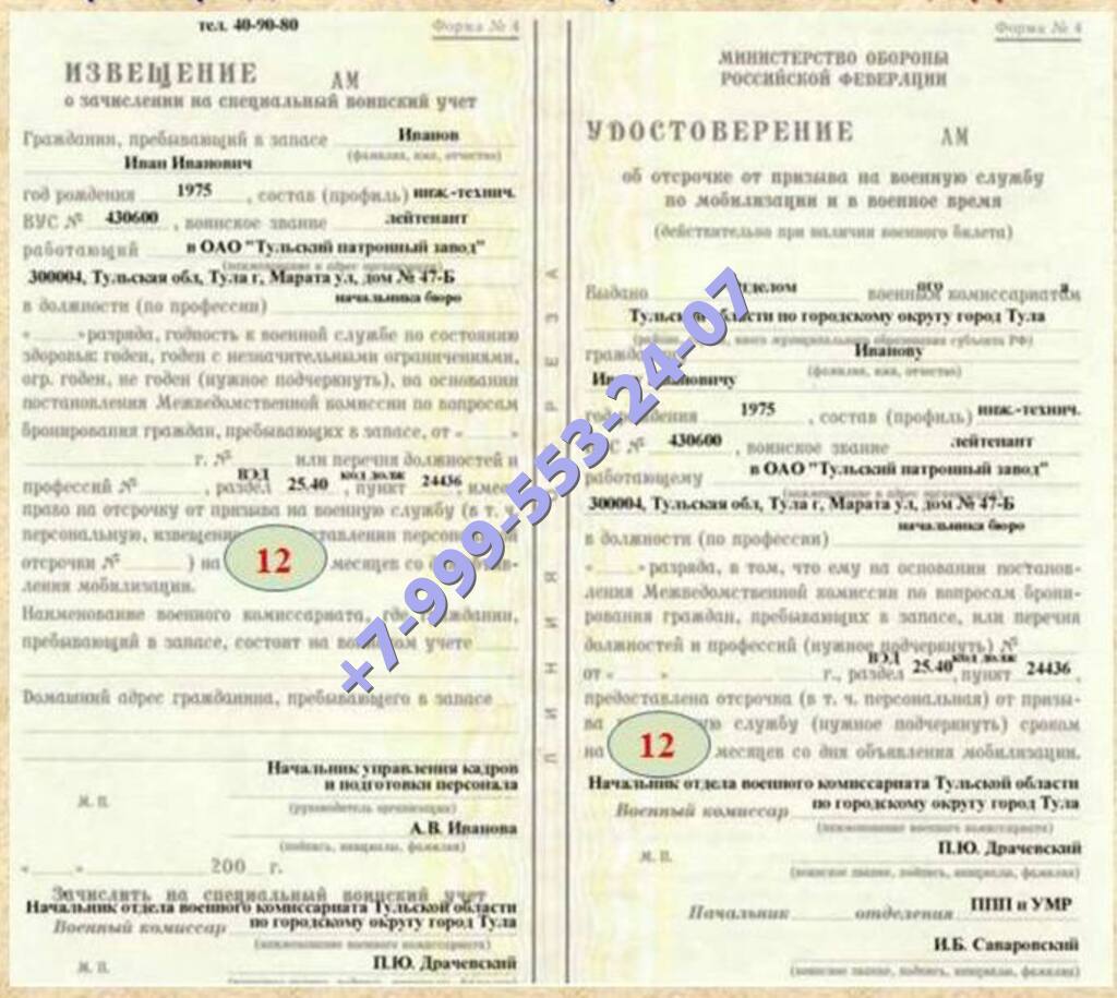 Наша компания предлагает купить в Реутове удостоверение об отсрочке на военную службу на максимально выгодных условиях для клиента. Документы легальные, использованы бланки государственного образца.